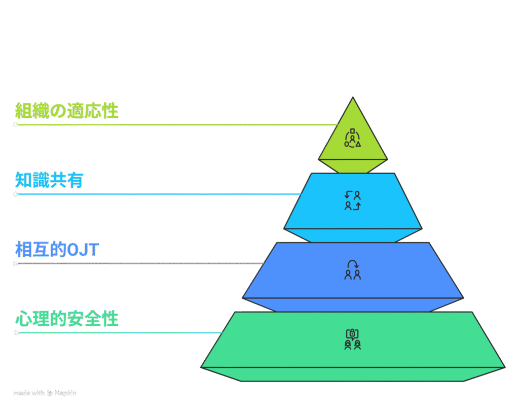 年功序列が基本の学校組織では、年長者が多くのことを知っています。でも一方通行のOJTだけでは心理的安全性は向上しません。加えて、一方通行のOJTだけではVUCAの時代を進むこともできません