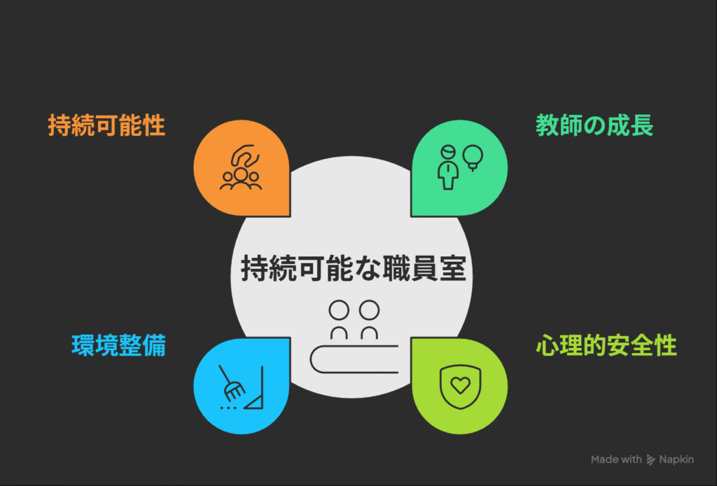 私が教頭とそれに先立つ首席(主幹教諭)時代の約10年間で、必要だと感じ取り組んできたことは、「教師としての成長・心理的安全性・持続可能な職員室・環境整備」の4つにまとめられます。