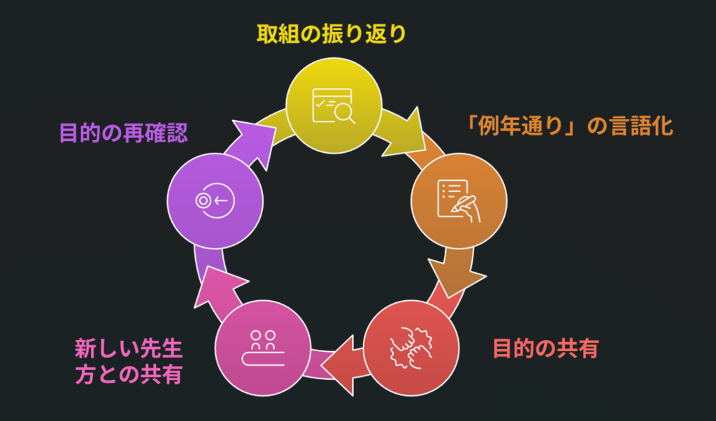 「例年通り」の言語化と共に、目的を明確にし、それら全てを新しく来た先生方と共有できれば最高です。前年度からいた先生方にとっても、改めて目的を再確認する良い機会になります。