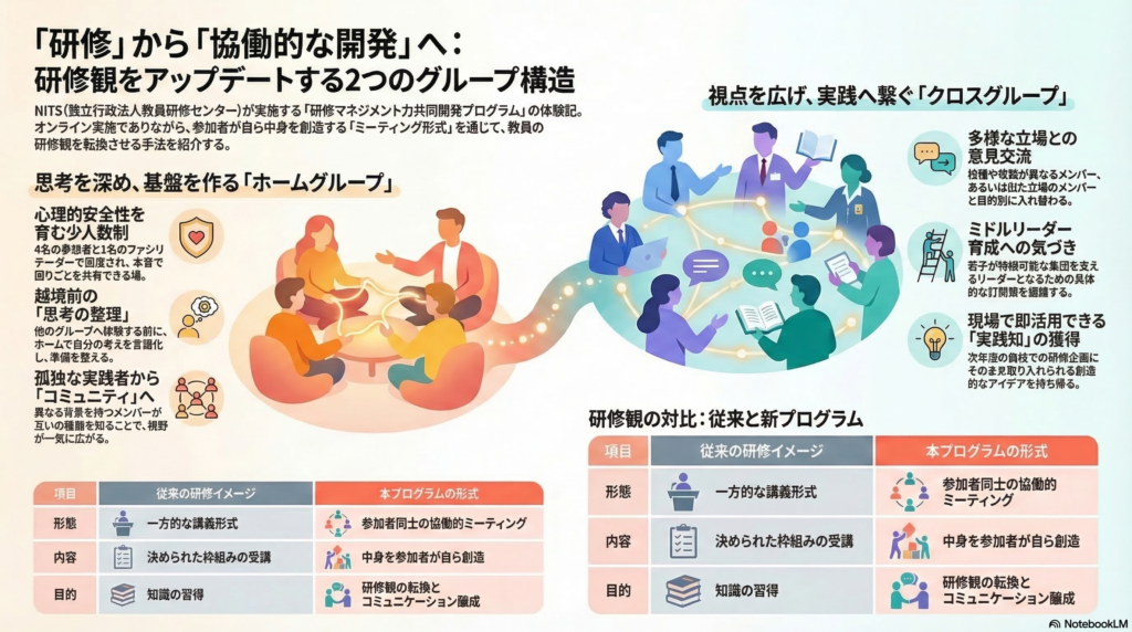 ホームグループでは、研修の企画運営に悩んでいる方や、教員の育成やサポートにチャレンジされている方など、私が知らない世界で奮闘されている方たちの話が聞けて、自分の視野が一気に広がった感じがしました。