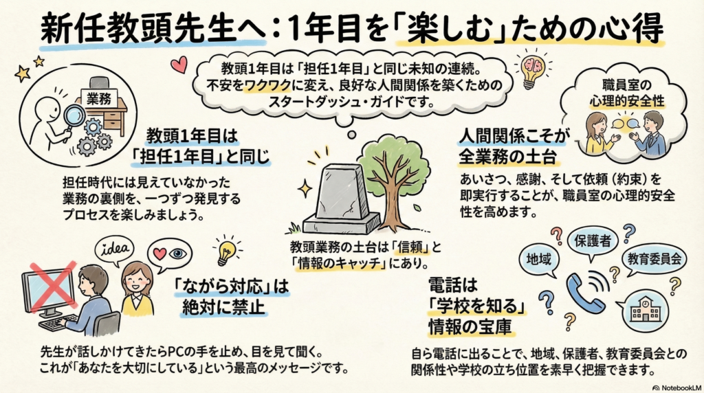 それと似ています。教頭も先生方が見ていないところで、色々なことをしています。教頭1年目は、その発見の連続。これまで知らなかった「教頭先生」を発見するのを楽しんでください。