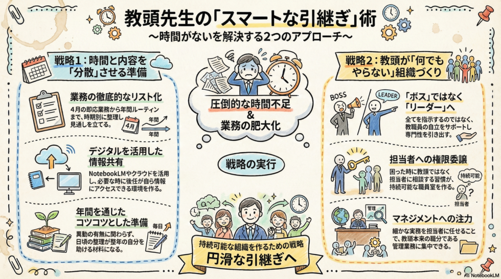 教頭間の引継ぎの大きな課題は、何と言っても「時間がない」ことです。他にも、「内容が膨大」、「1人で抱えている業務がある」といったことがあります。